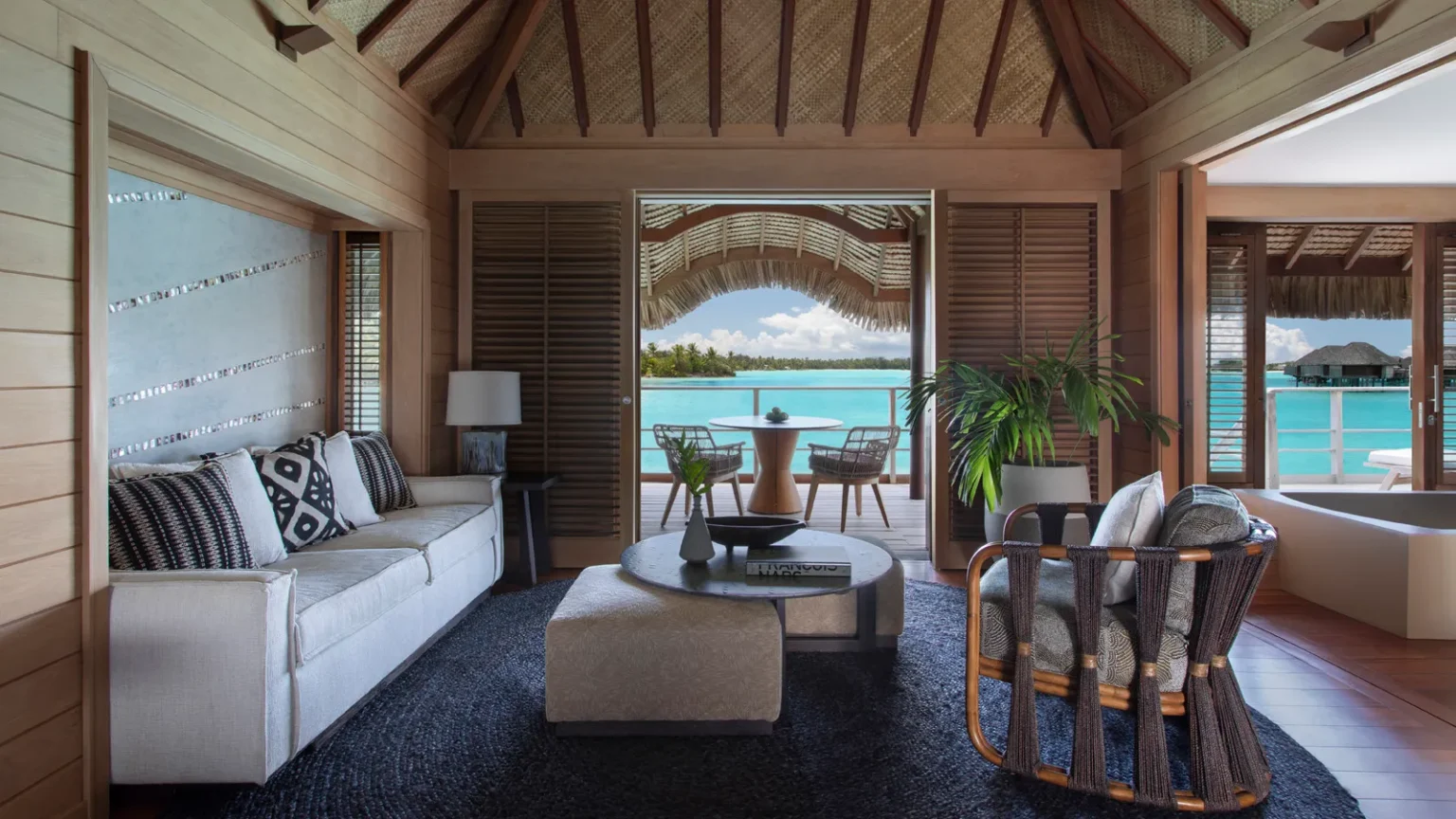 Több mint 500 vízre épült bungaló, amelyek 3-6 m (10-20 ft) magasan helyezkednek el a lagúna felszíne felett, garantálja a teljes intimitást. Mindegyikhez saját terasz tartozik, közvetlen lépcsővel a türkizkék vízhez, valamint plunge pool panorámás kilátással. A jellegzetes üvegpadló, amelyet ” Tahitian TV ” néven ismernek – a nappalit privát akváriummá varázsolja, tele korallokkal és trópusi halakkal.